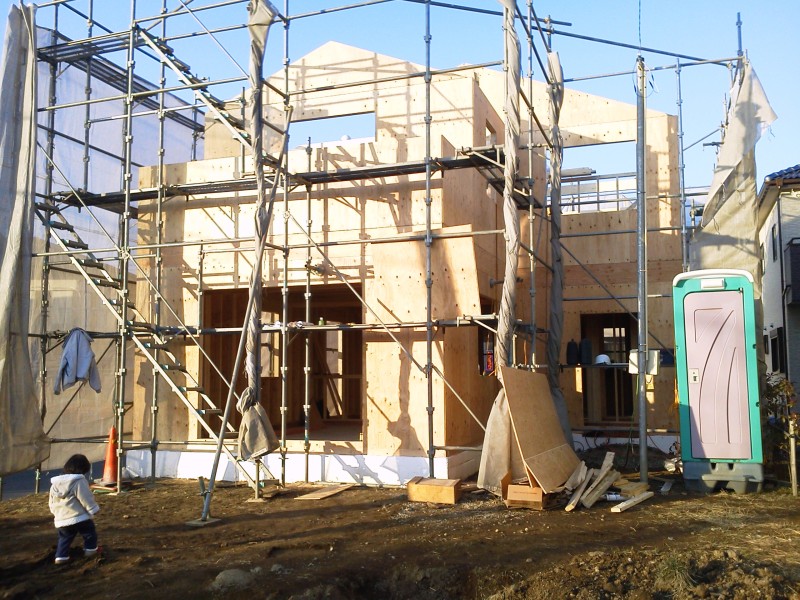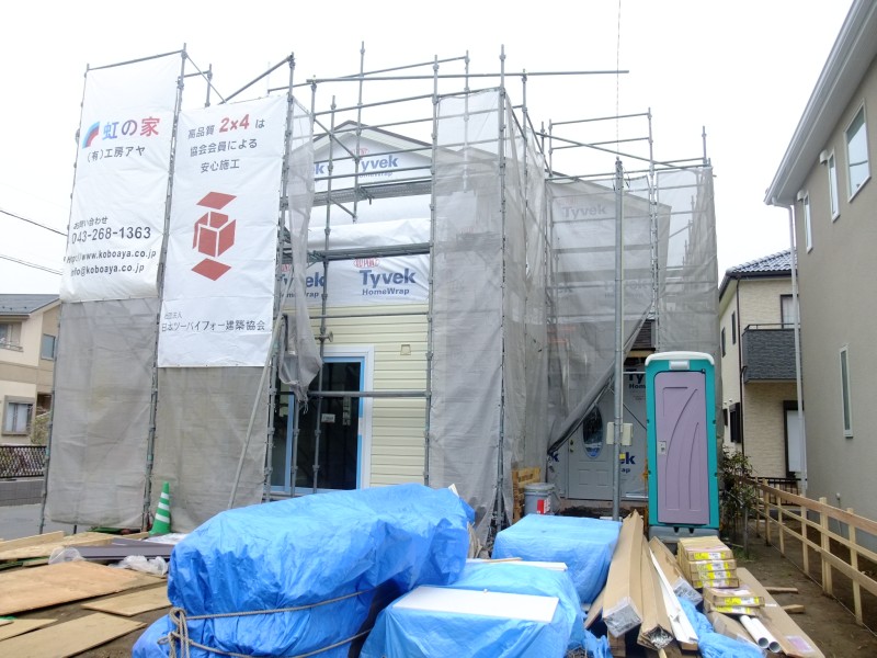 ツーバイフォーは雨ざらし期間がやや長めの在来工法と違い、早い段階で(ミイラのように)全面的に防水シートで覆ってしまいます。