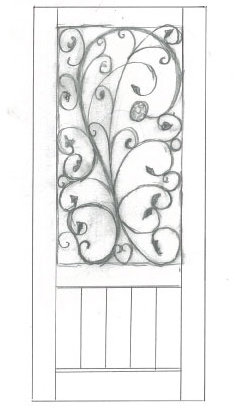 デザイン的には木製の扉で、長方形に大きく切り抜いた部分にガラスが貼ってあり、蔦の葉と茎のようなニョロニョロっとしたロートアインアンが内部にはめ込まれているのが理想です。